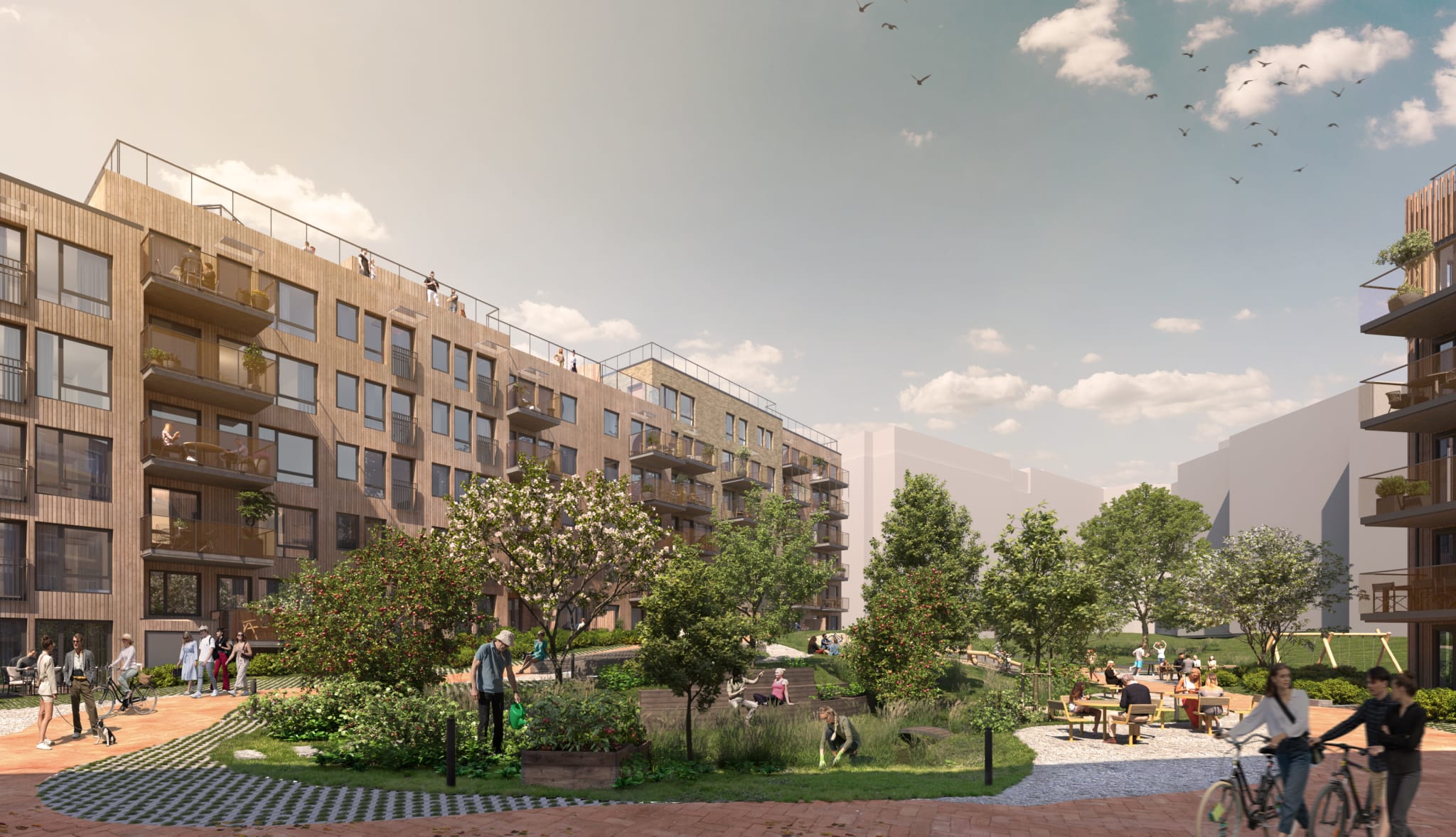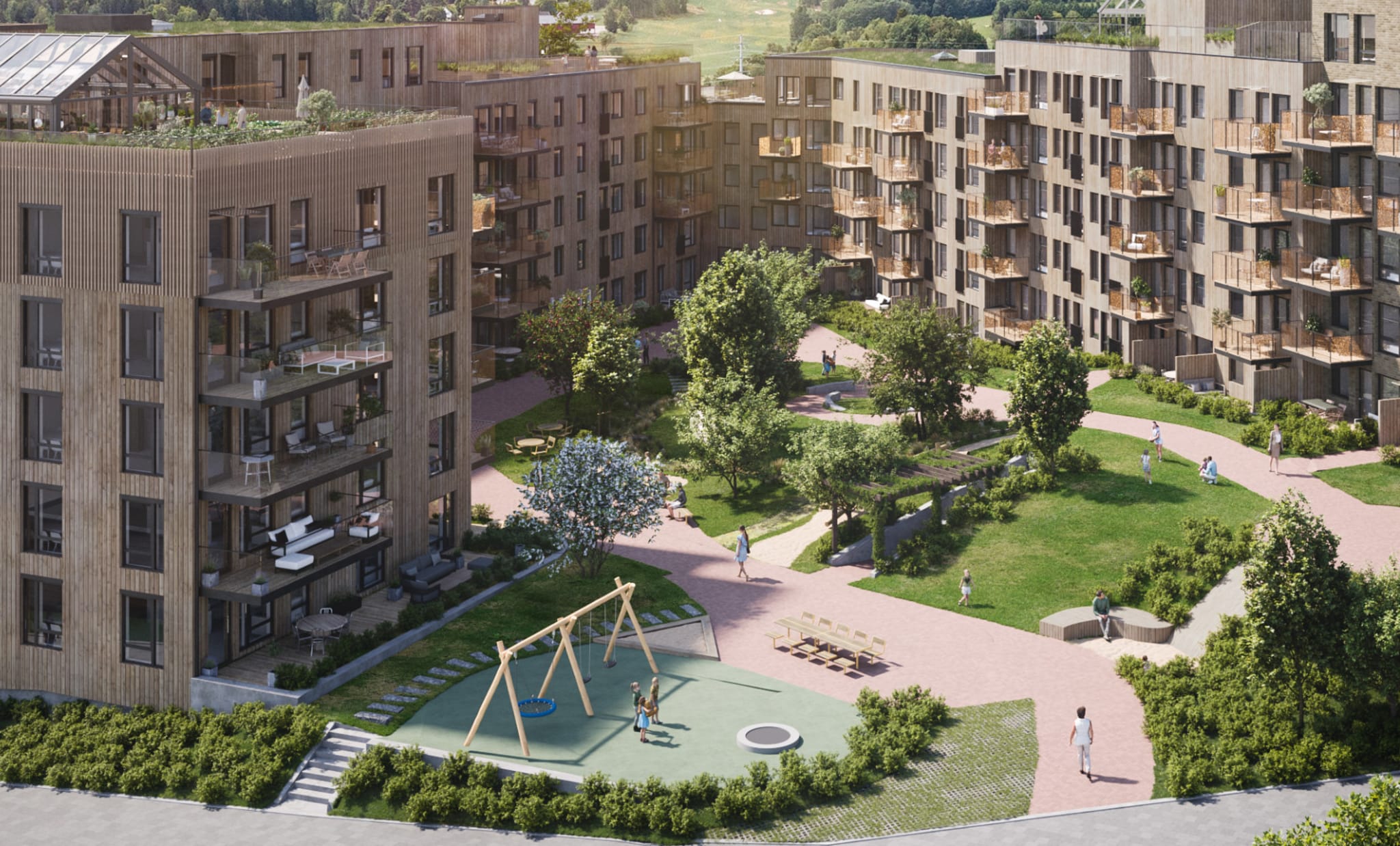 Gårdsområdet vil bli oppdelt i soner som hver vil ha sitt særpreg med ulike frukttrær, pergolaer, plantekasser, leke- og treningsapparater, samt en rekke sittegrupper der det vil være hyggelig å ta med kaffekoppen ut i de frodige omgivelsene. Det blir som en forlengelse av ditt eget hjem.