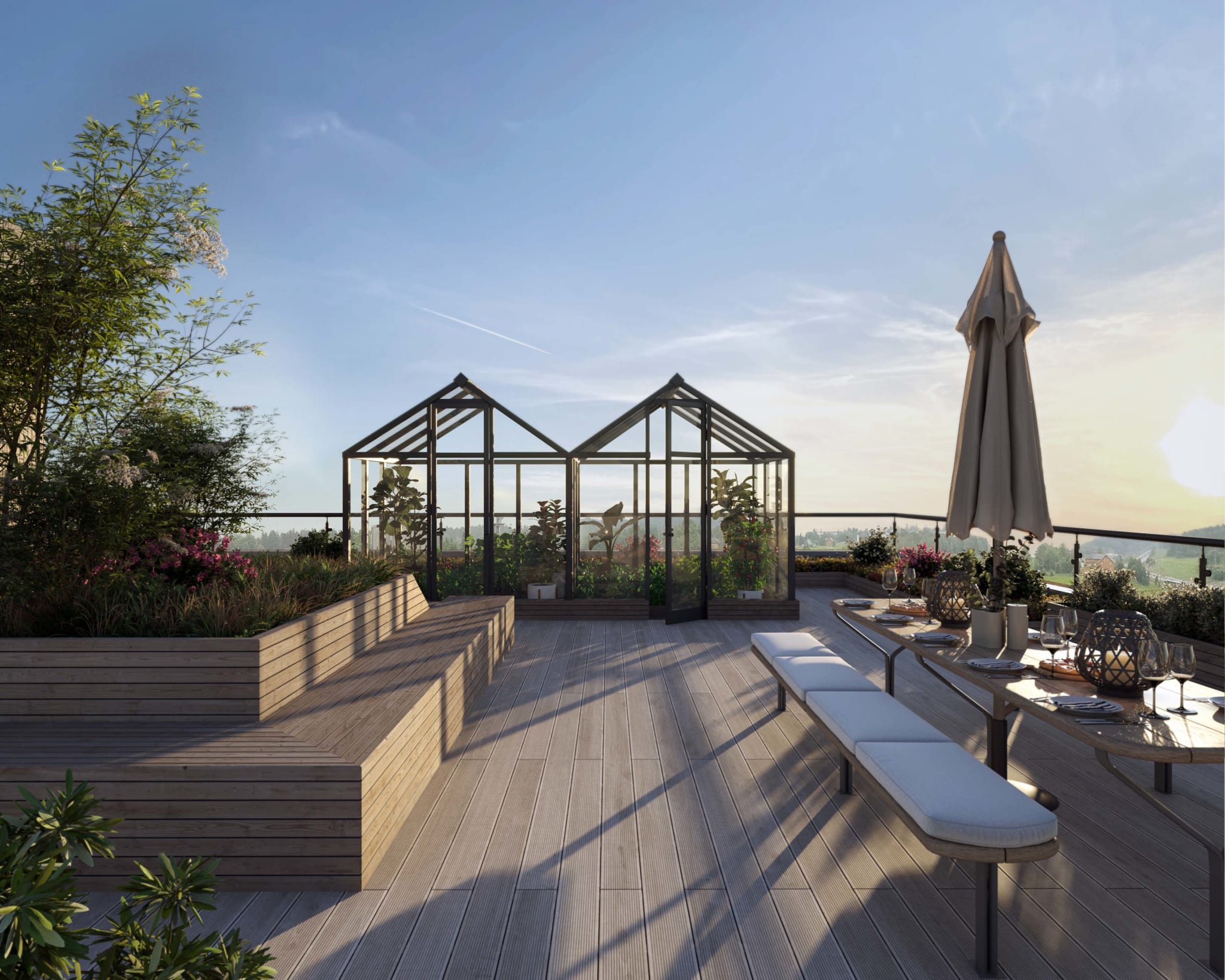 De grønne fellesområdene, både på takene og i gårsrommet fungerer som sosiale knutepunkt for naboene. Her vil det komme flotte rekreasjonsarealer, sittegrupper, og ikke minst vil takterrassen tilby flere muligheter for å drive urban dyrking der du kan aktivisere grønne fingre og sette hagegleden fri. Det er mange felles goder for beboerne i Gartneritaket.