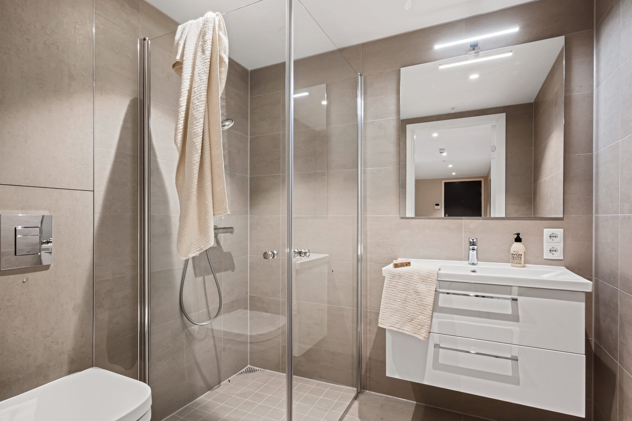 Kjøkkentypen «Moderne» fra Sigdal har fronter i en lekker, lys gråfarge og sorte håndtak og lys Silestone benkeplate med underlimt vask. Hvitevarene er fra Bosch. Badet har fliser på 60x30 cm både på vegg og gulv. Gulvet får lekkert matt, hvitlakkert 1-stavs eikeparkett.