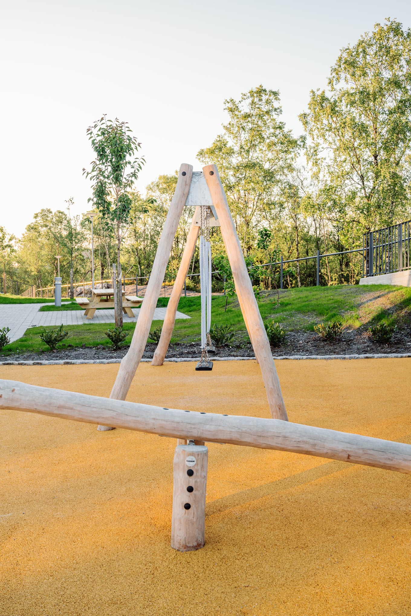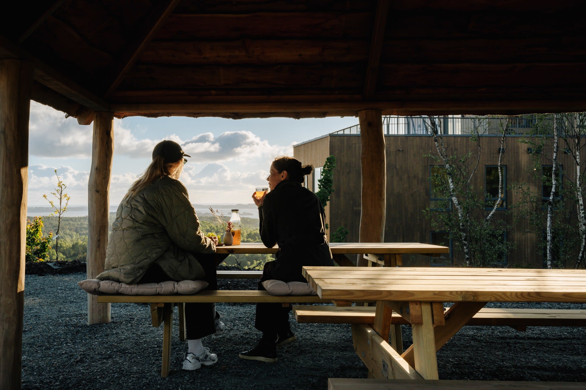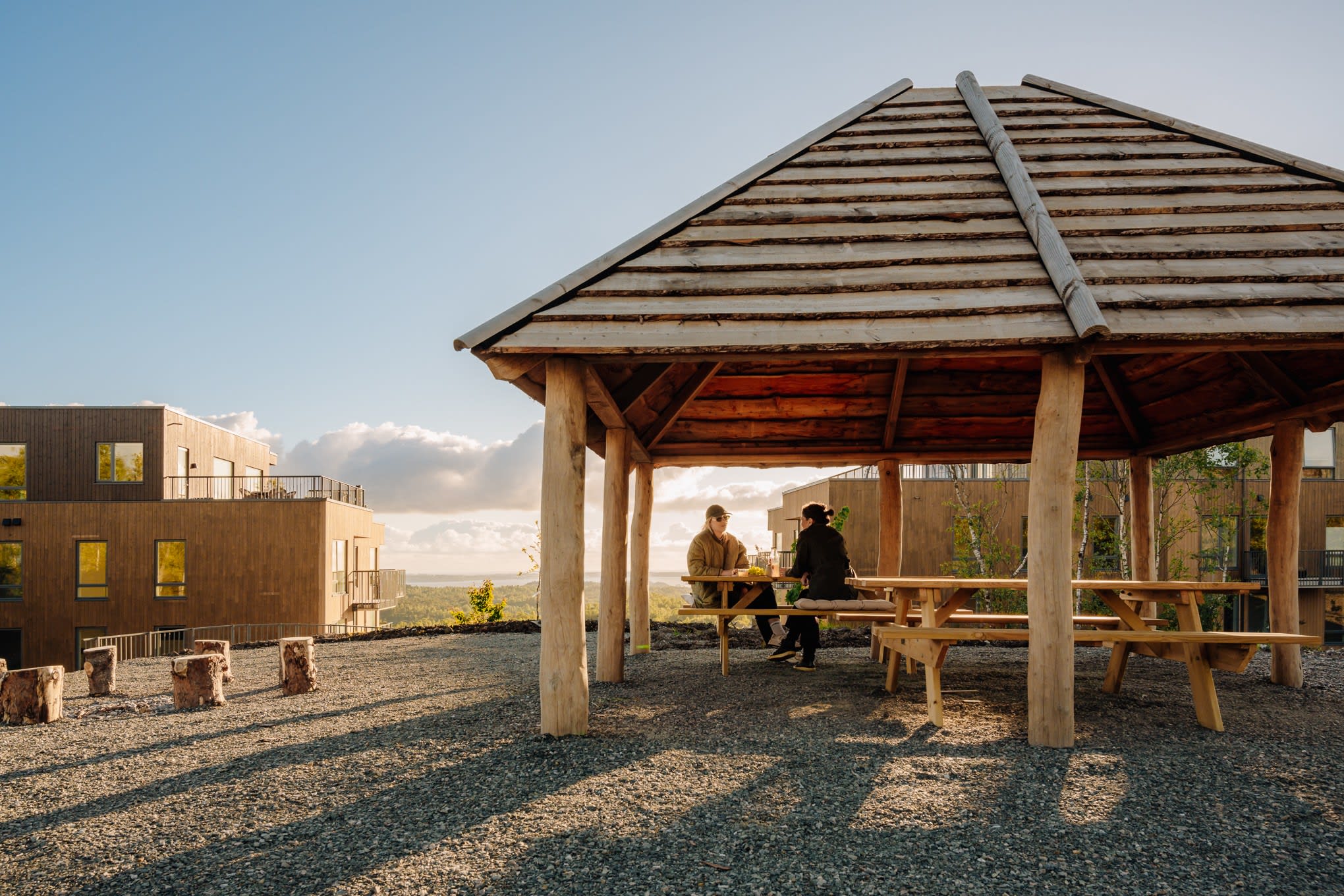 Fellesområdene er nøye planlagt for å tilby noe for alle. Med en stor paviljong i tre, et amfi, benker, aktivitetsområder og lekeplass, blir dette et sted hvor både barn og voksne kan skape gode minner sammen.