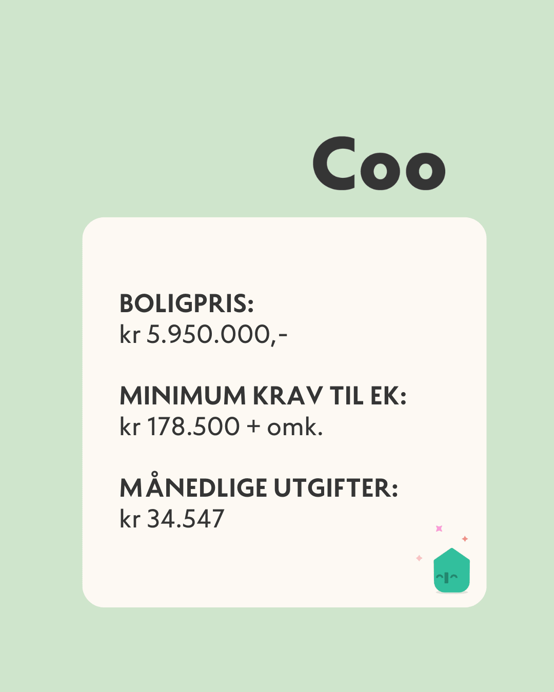 En leilighet til kr 5 950 000,- krever normalt 10 % egenkapital – altså kr 595 000,-. Med Coo Deleie holder det å stille med kun kr 178 500,- i egenkapital – resten av egenkapitalkravet dekker Coo.