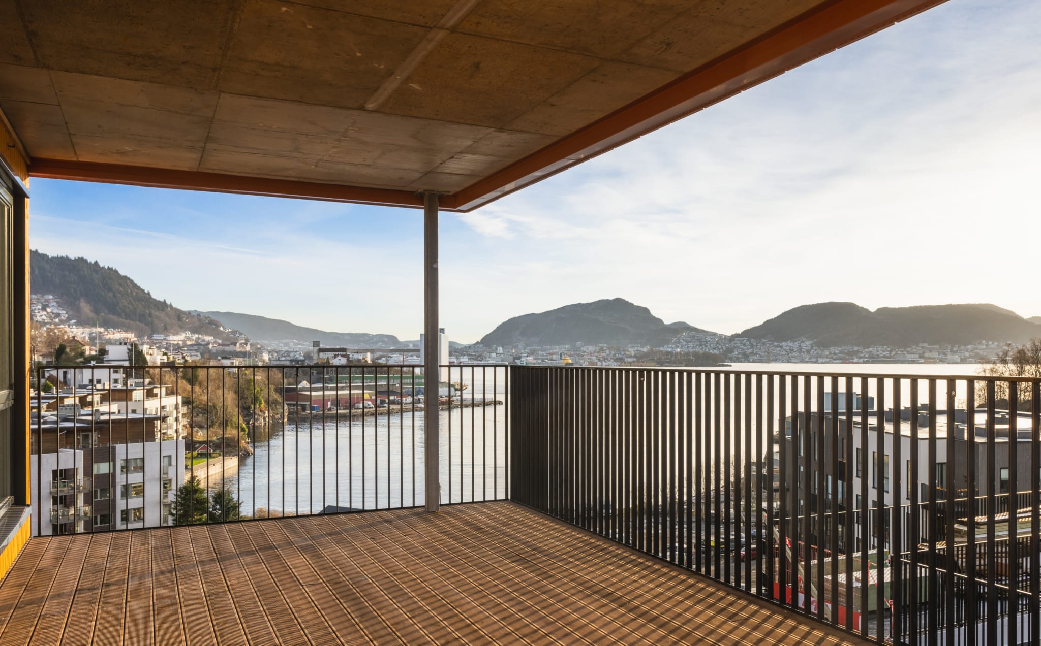 Forestill deg å våkne opp i et hjem med åpne, lyse rom, stor takhøyde og en luftig uteplass. Med vinduer som åpner seg til landskap som lever og puster med årstidene. Der frihetsfølelsen forsterkes av utsikten mot byfjord og byfjell – og din neste treningsøkt eller fritidsaktivitet er rett utenfor døren.