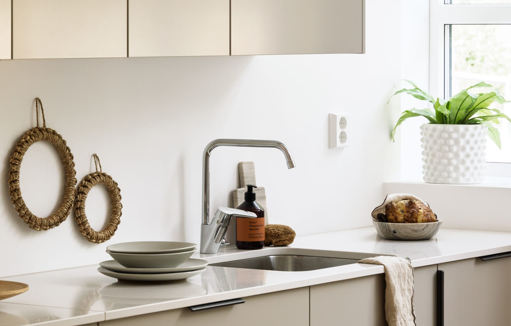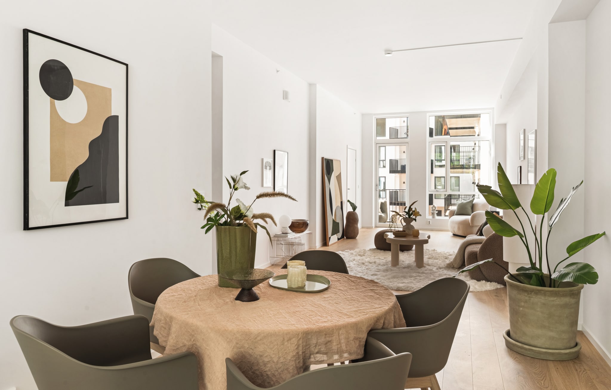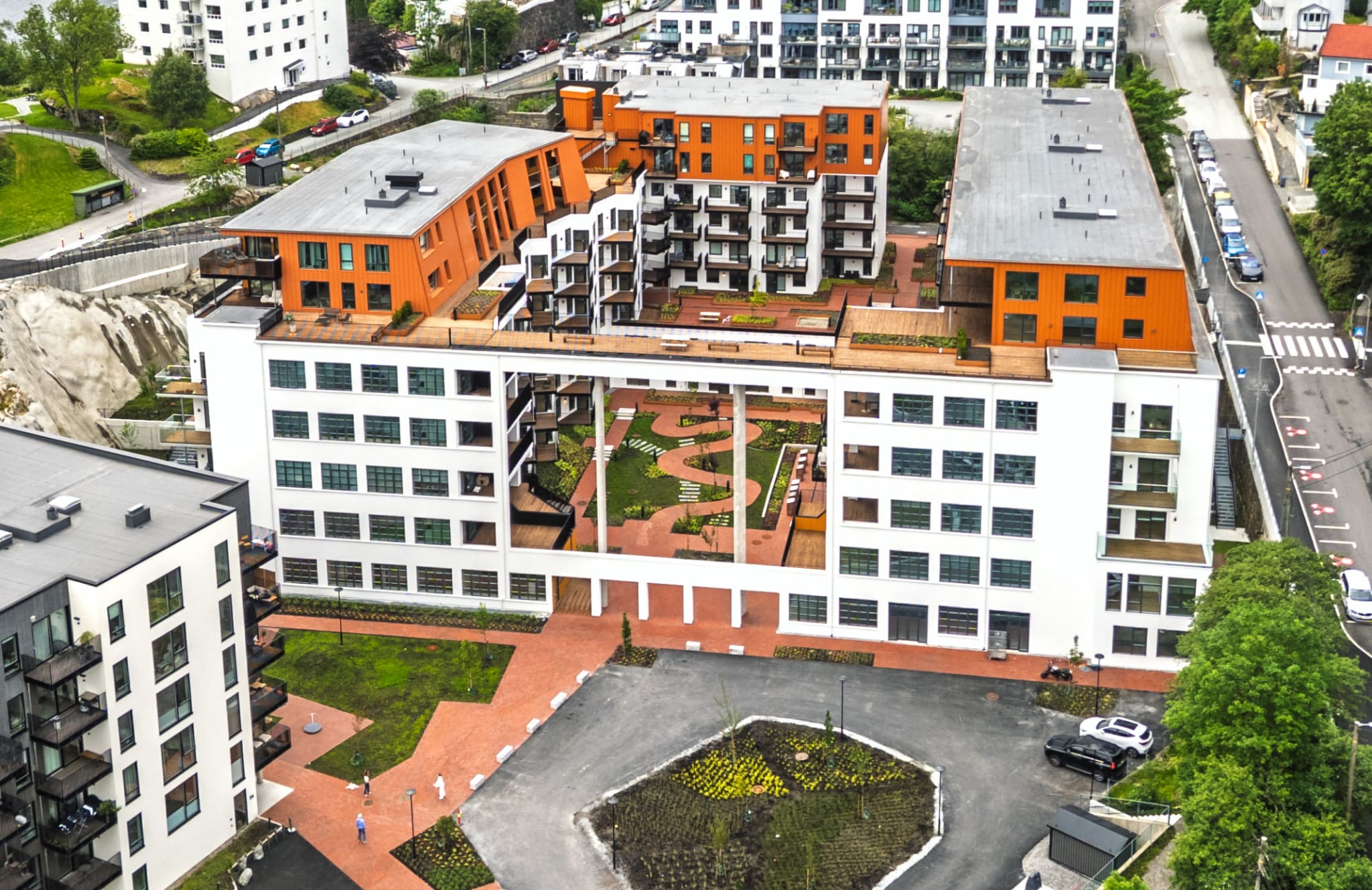 Den flotte åpningen vil oppleves spektakulær både fra utsiden av kvartalet, fra selve gårdsrommet og ikke minst fra leilighetene. Vi valgte å holde fasaden i hvit, pusset mur med innslag av tre, og kle toppetasjene i terrakottafargede metallplater. Paletten står i stil med ferdigstilte bygg nord for kvartalet og harmonerer godt med industrihistorien på stedet.