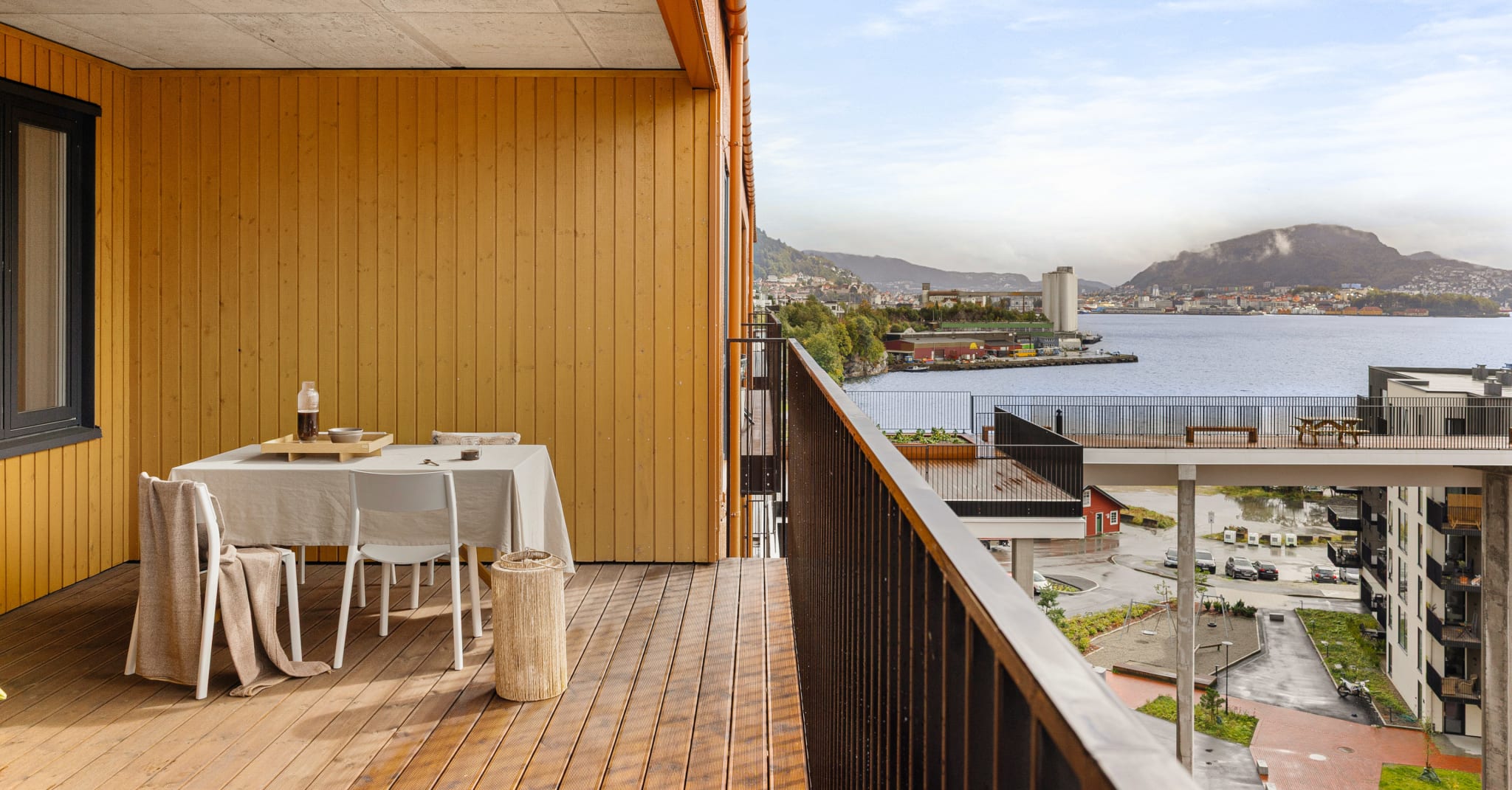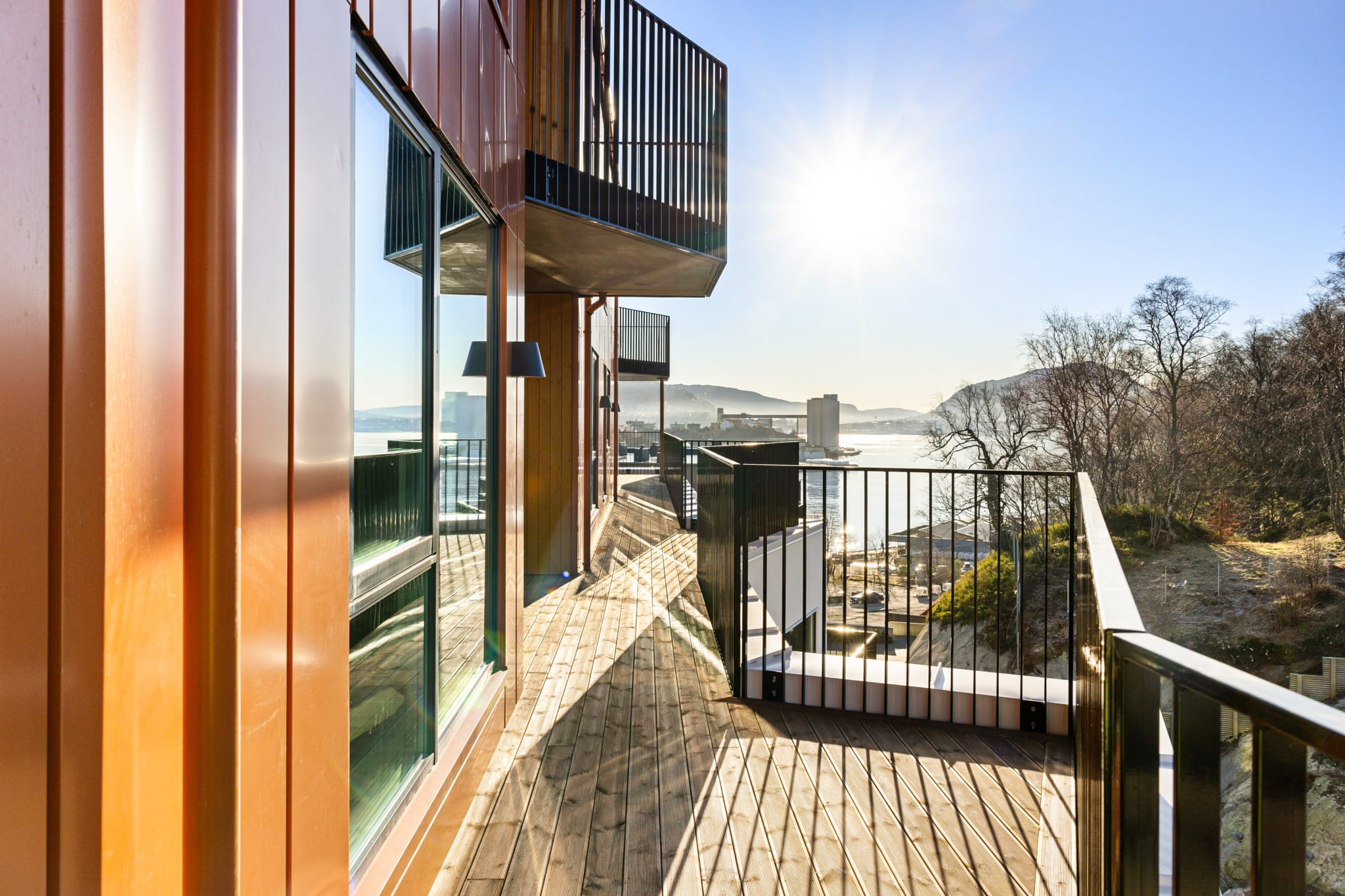 I de to øverste etasjene tegnet vi inn eksklusive toppleiligheter, de største med inntrukne balkonger som får ettermiddagssol fra sydvest og spektakulær utsikt mot byen. Store vinduer og private uteplasser som ligger skjermet fra naboer er andre pluss. For at vestfløyen skulle få fjordgløtt valgte vi å vinkle fasadene mot stuen. Leilighetene i Merinobygget får ekstra takhøyde og tilsvarende høye vinduer. Høyest industrikarakter får de som ligger i den gamle fabrikkfasaden, hvor de storslåtte rutete vinduene spiller hovedrollen. Den eksepsjonelle storheten i bygget blir godt bevart, og så å si alle leilighetene kan nyte den nydelige sjøutsikten.