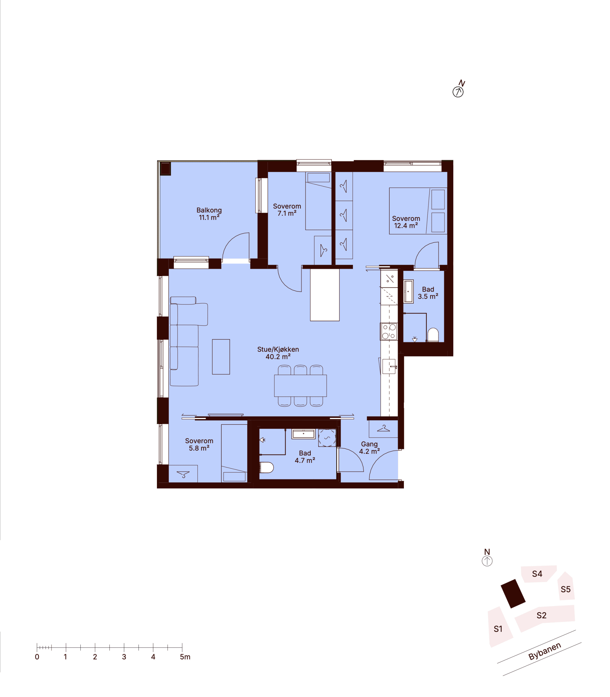 Visningsleiligheten er boenhet S3-502. Avvik kan forekomme. Visualiseringer og boligvelger på prosjektsiden dokumenterer ikke spesifikke kvaliteter eller egenskaper ved eiendommen og er ikke en del av kontrakten eller prospektet.