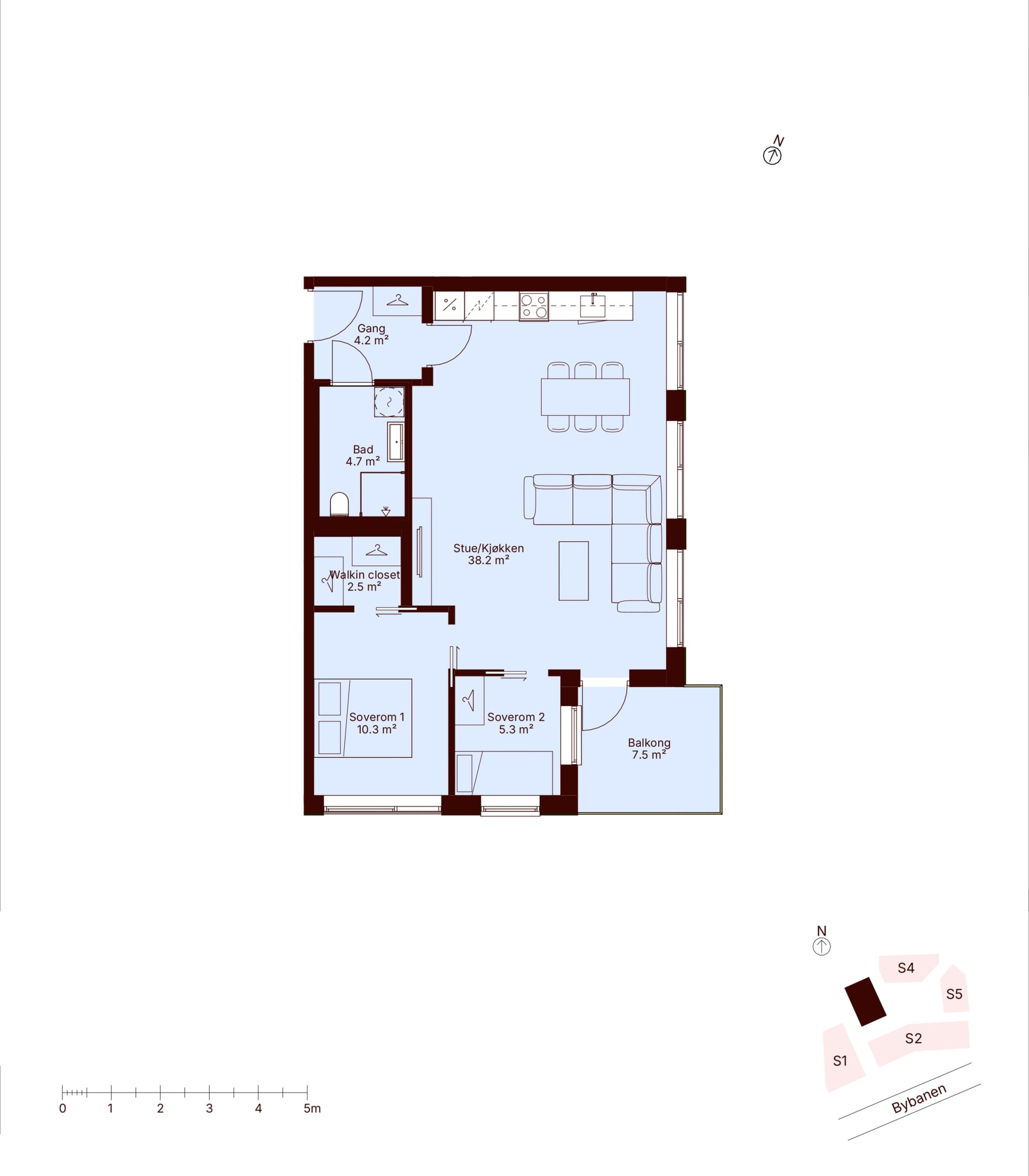 Visningsleiligheten er boenhet S3-502. Avvik kan forekomme. Visualiseringer og boligvelger på prosjektsiden dokumenterer ikke spesifikke kvaliteter eller egenskaper ved eiendommen og er ikke en del av kontrakten eller prospektet.