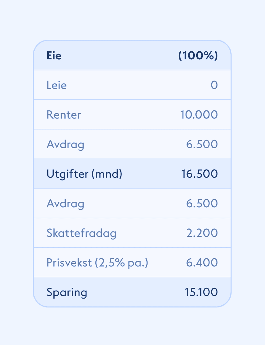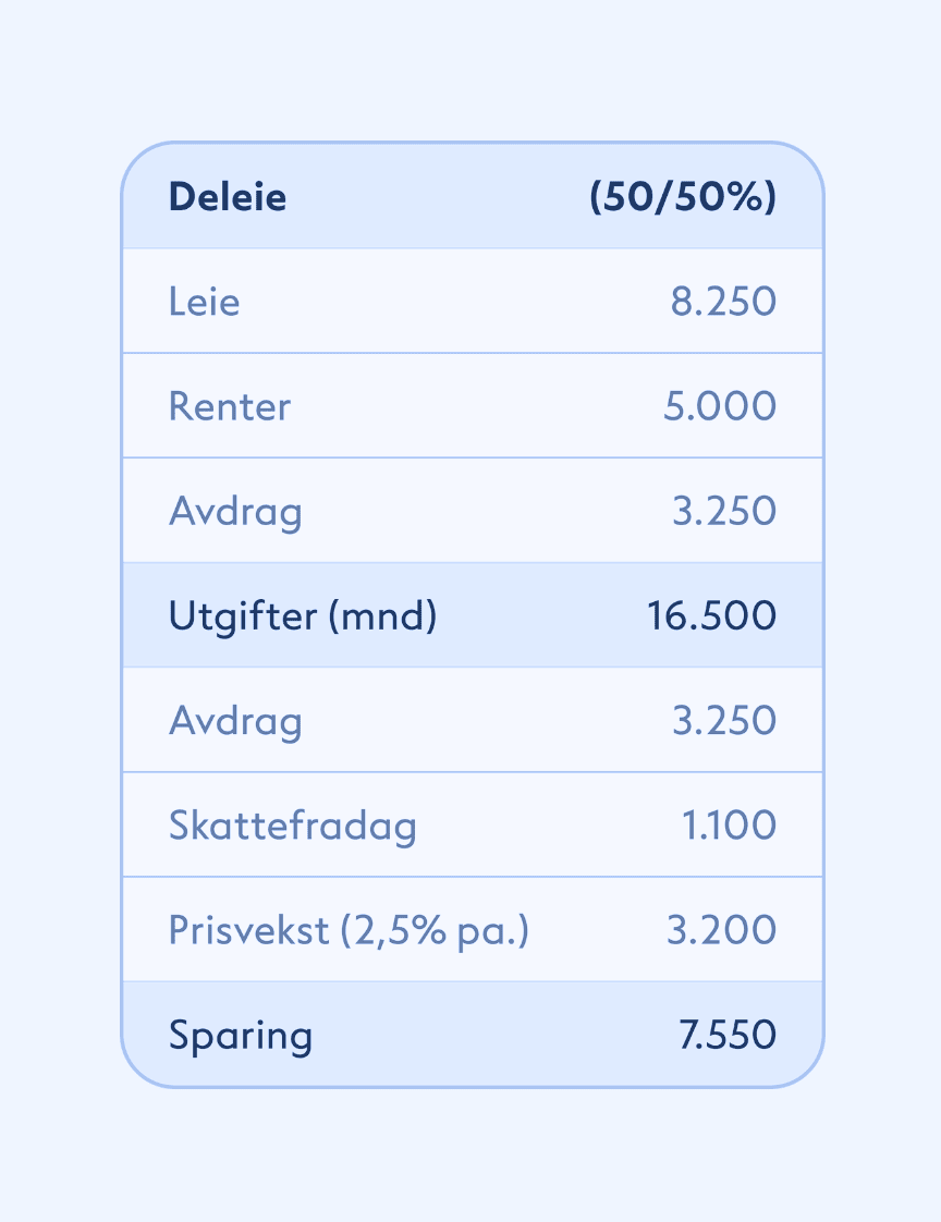 Tallene over illustrerer en deleieøkonomi i en bolig til 3 mill med en eff. rente på 5,0% på boliglånet, i relasjon til en sammenlignbar bolig- og leieøkonomi.