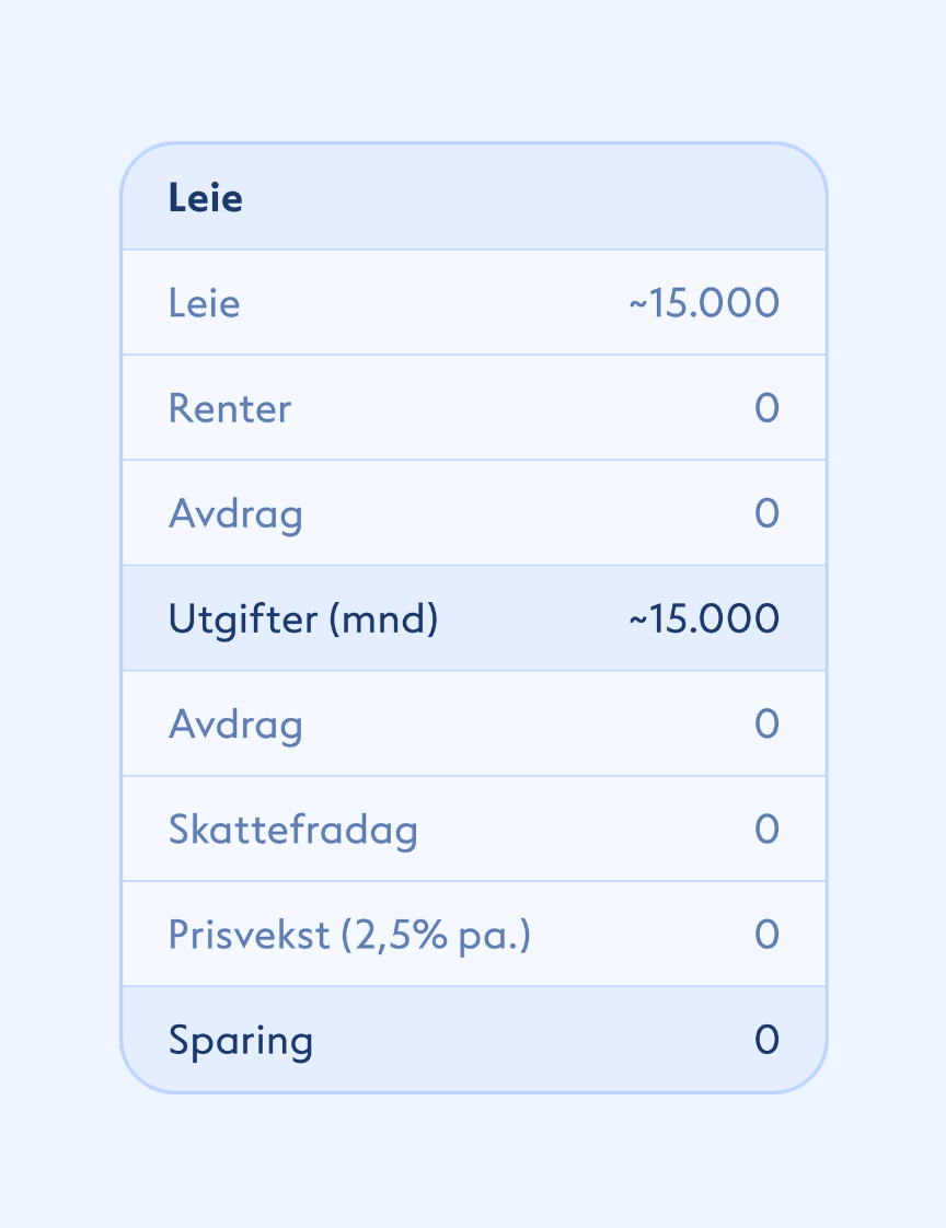 For at du raskest mulig skal komme i posisjon til å eie mest mulig av boligen, betaler du en leie som står i forhold til lånekostnadene og din eierandel. På denne måten får du muligheten til å spare opp egenkapital i din egen bolig over tid ved å nedbetale boliglånet, og dra nytte av forventet verdiøkning over tid.