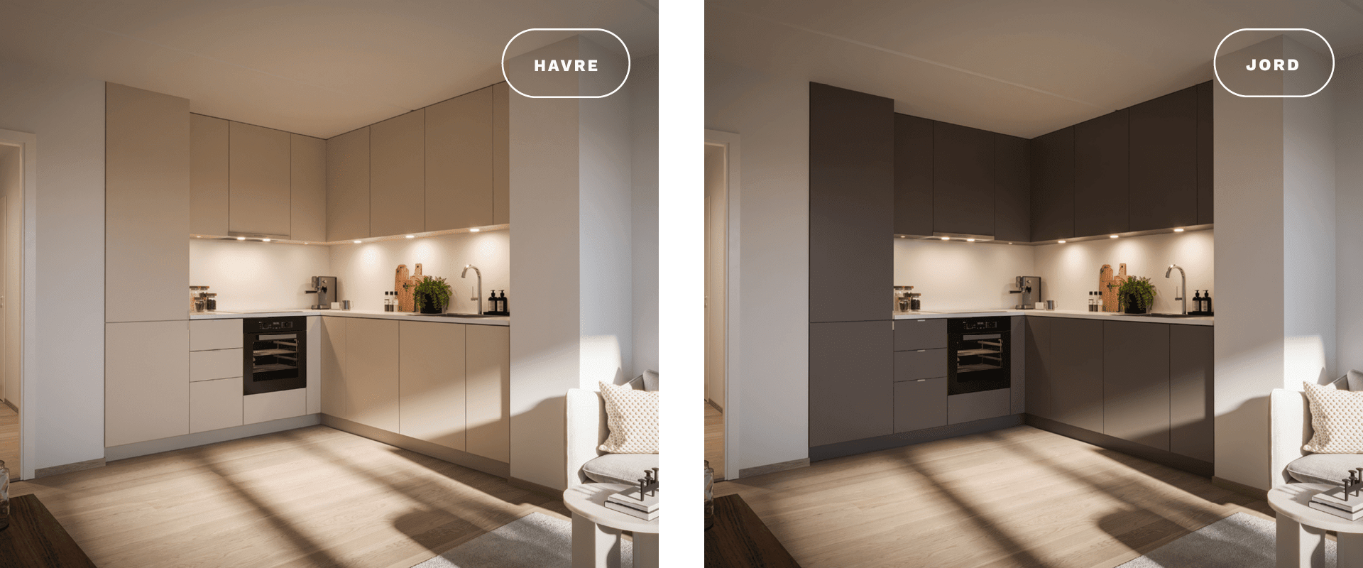 I Tamburparken kan du velge mellom to stilretninger – Havre og Jord – som gir kjøkkenet sitt særpreg gjennom farge og uttrykk. Uansett hva du velger, får du et funksjonelt kjøkken med integrerte hvitevarer, god oppbevaringsplass og en slitesterk benkeplate med naturligfargespill. naturlig, varmt og åpent.
