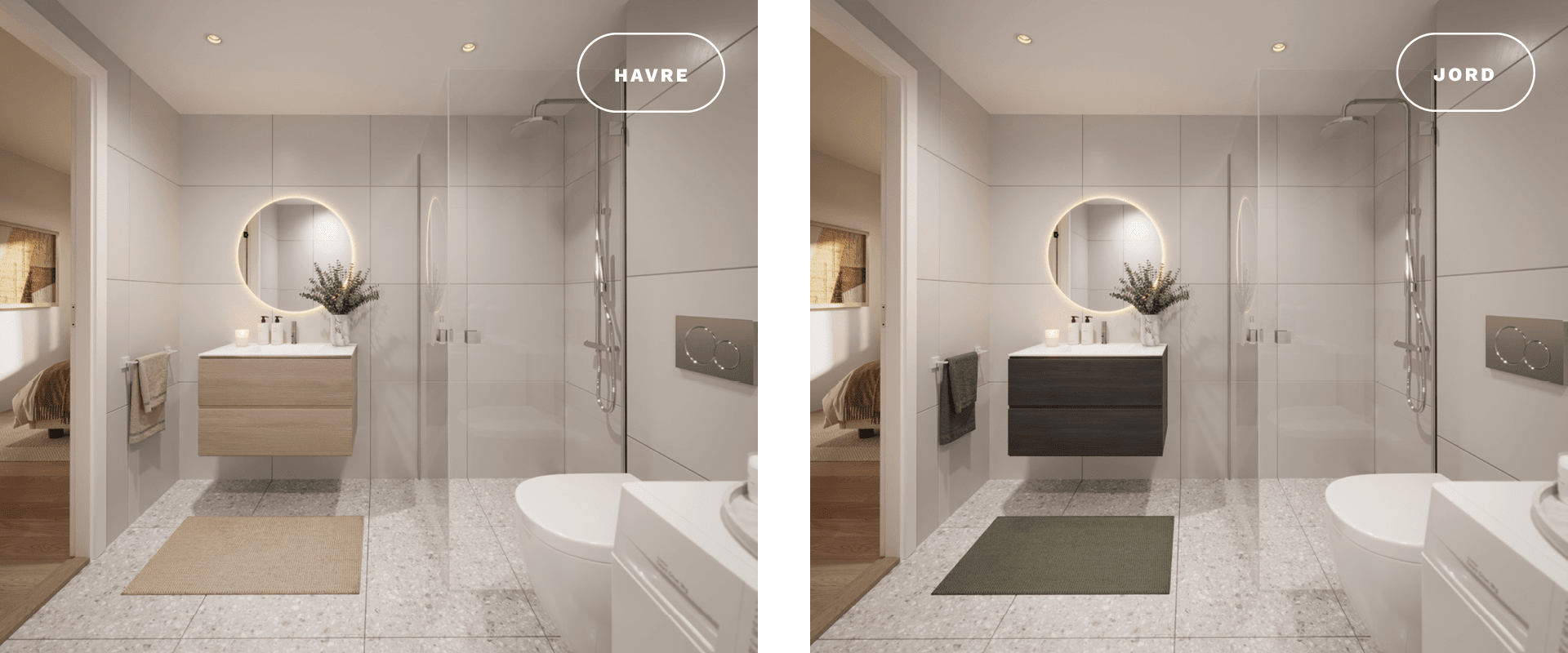 Også på baderommene kan du velge mellom to stilretninger – Havre og Jord – som setter tonen gjennom farge og uttrykk.